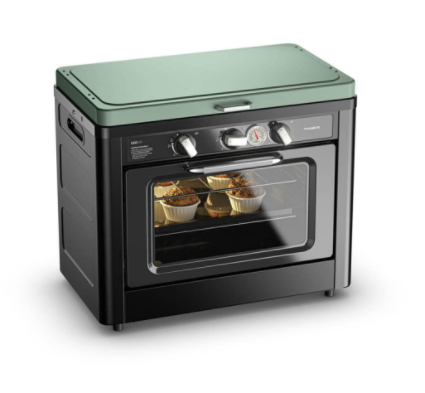 Suppose you'd like to bake while camping? One of the most useful and portable camping appliances, this stove/oven combo does double duty as a stove and an oven. This propane-powered appliance can bake a pizza while the rest of the meal is being prepared on the top-mounted double burner.